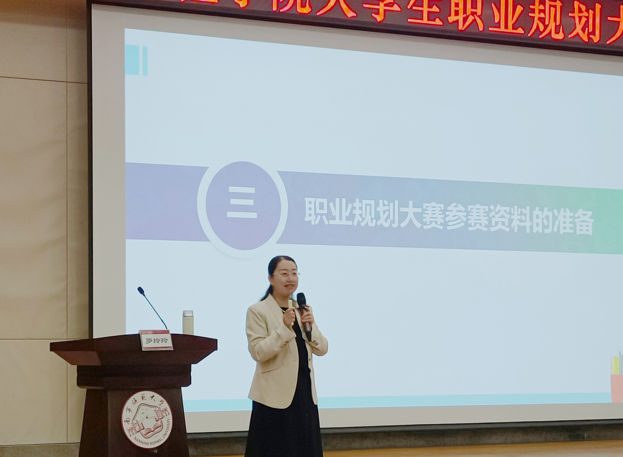 于武鸣校区图书馆报告厅举行了大学生职业规划大赛赛前培训会。本次会议邀请了国家一级人力资源管理师、国家一级职业指导师、国家高级生涯规划师罗玲玲担任主讲嘉宾,学院党委书记陈兵、团委书记黄海嫚、教师代表龙晓虹以及学院全体参赛学生参加了此次会议。会议由学院团委书记黄海嫚主持。