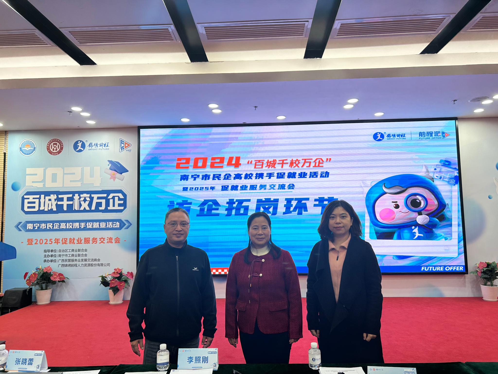参加2024百城千校万企南宁市民企高校携手促就业活动暨2025年促就业服务交流会。本次交流会由南宁市工商业联合会主办,广西民营服务业发展交流商会、广西锦绣前程人力资源股份有限公司承办。学院党委陈兵书记、黄宇副书记,负责就业工作的辅导员共同参加了本次交流会。现场共有17家参会企业参加了本次促就业交流会。