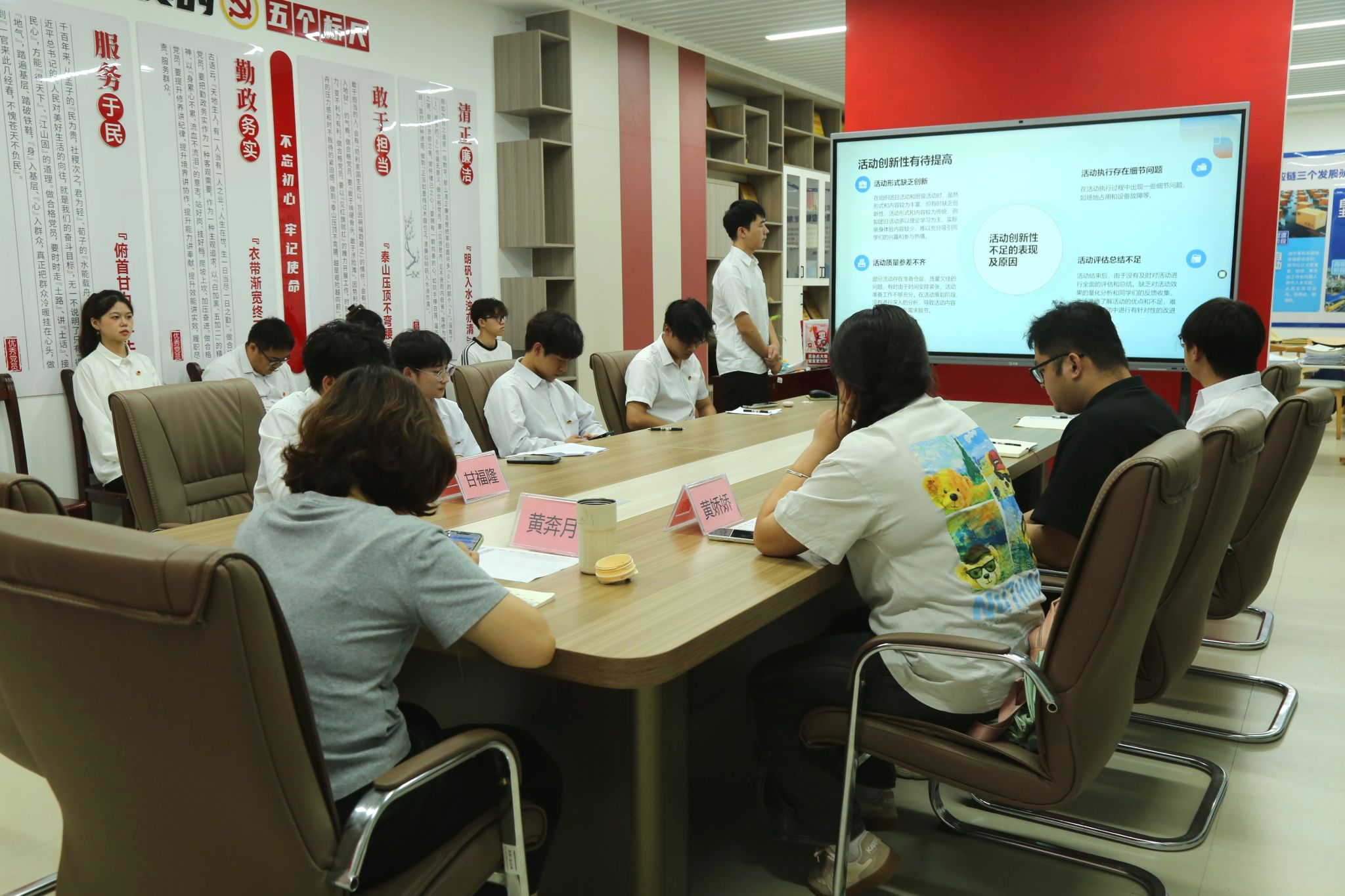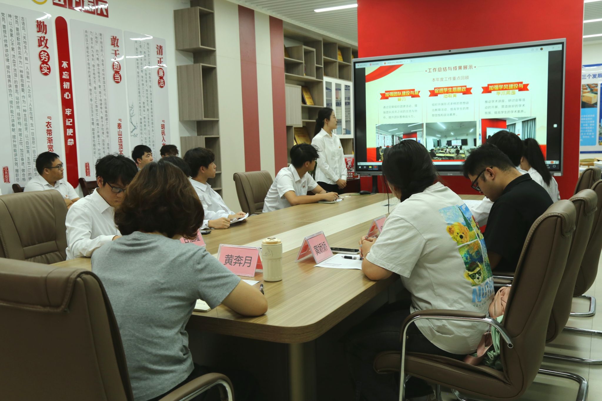 会议在庄严的国歌声中拉开帷幕。各团支部书记依次上台对2024-2025学年的工作进行汇报。他们围绕团支部建设主要情况、工作总结与成果展示等方面结合ppt进行阐述,详细介绍了团支部工作的开展情况,指出工作中出现的问题并提出改进措施,并表明未来的工作计划与展望。