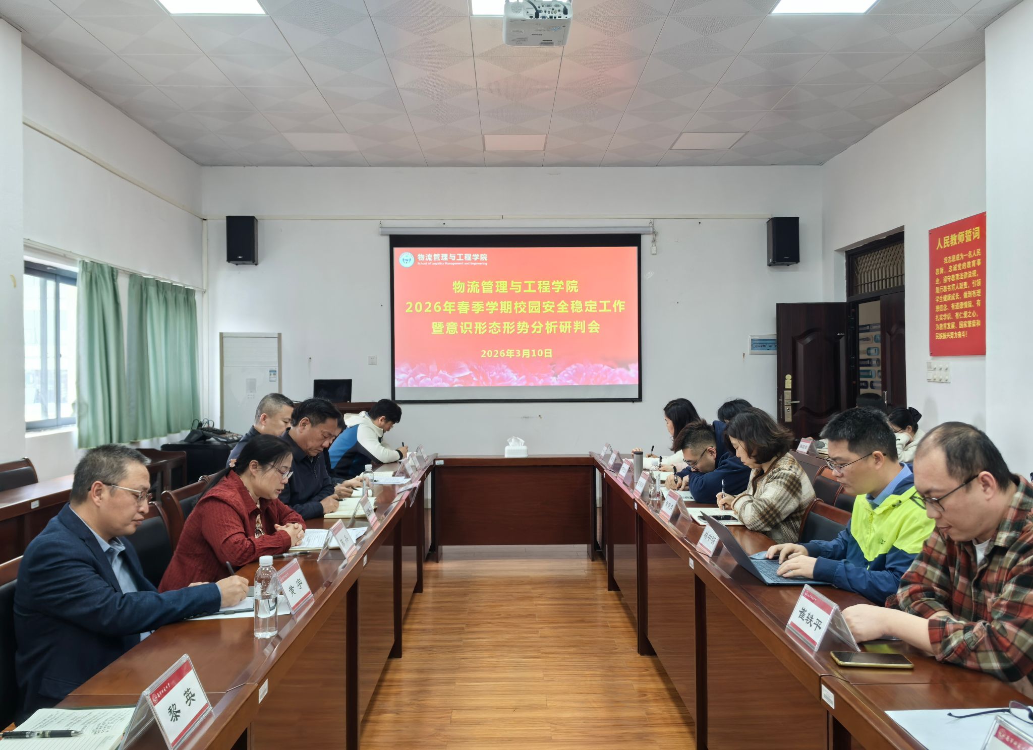 在武鸣校区地化楼C414室召开2026年春季学期意识形态和安全稳定工作形势分析研判会,学院全体教职工参加会议,会议由学院党委书记陈兵主持。