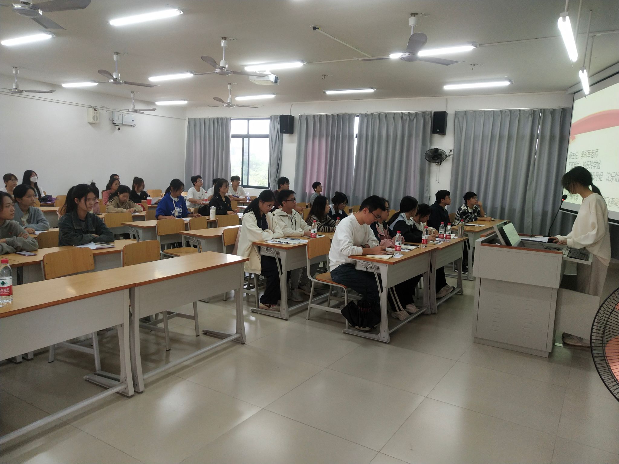 会议开始后,全体到场人员齐唱中国共产主义青年团团歌,歌声整齐而响亮,展现出了同学们良好的精神面貌。会议上,16名入党积极分子候选人依次上台,就自己思想上、学习上、工作上以及生活上等方面进行发言,并回答党支部代表、组织部代表、下班党员和助班的提问,言辞恳切、话语真诚。到场嘉宾们积极提问,深入了解候选人们的品质,挖掘其入党动机。会议过程中,候选人们认真发言,表达其对加入党组织的向往和对服务人民的渴望,严肃对待此次会议。
