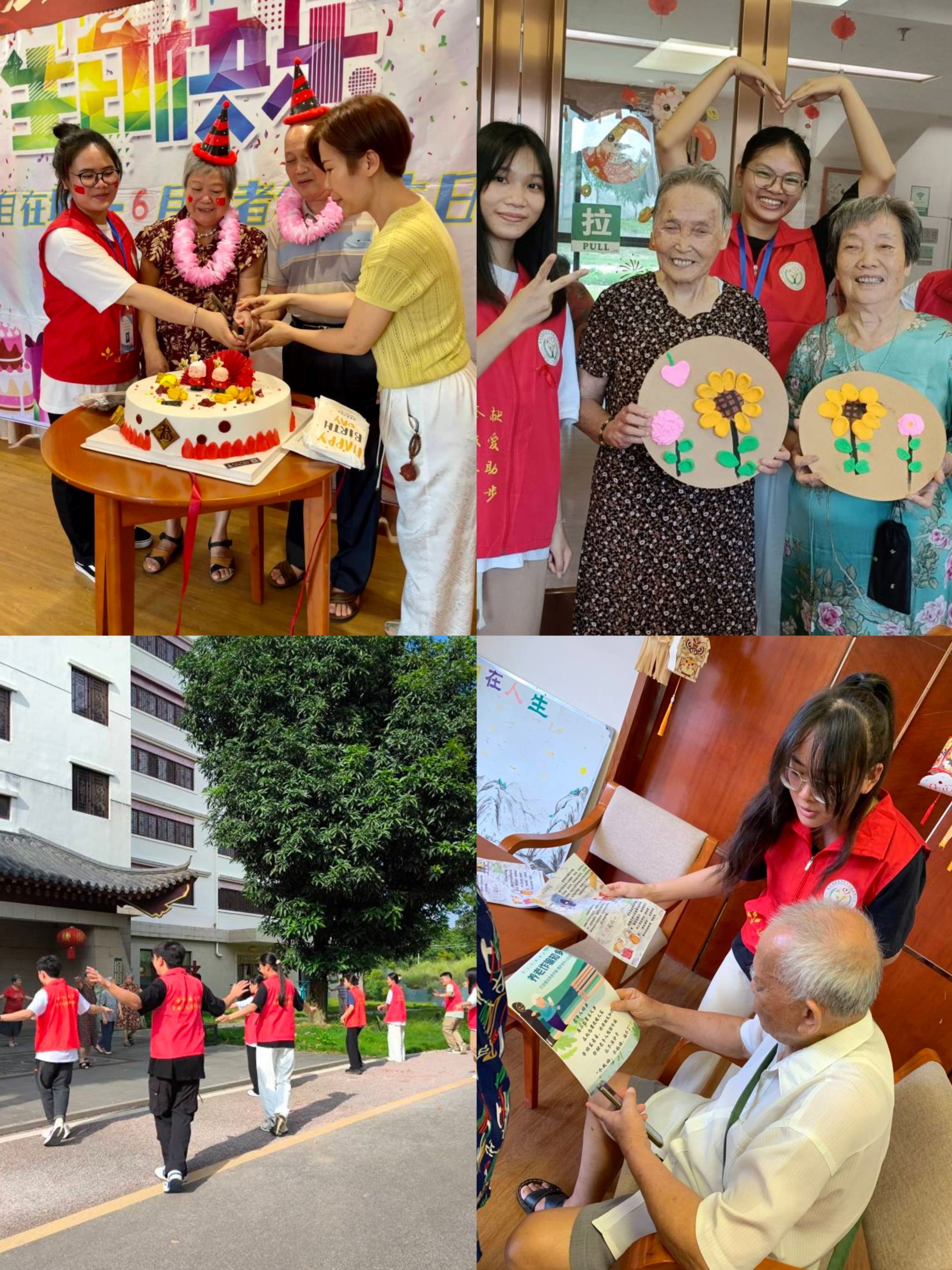 6月28日下午,志愿者们受邀参加了太和自在城养老院老年人们的生日会。志愿者们精心布置场地,用彩色气球和温馨的彩带营造出欢乐的氛围。在生日会上,志愿者们用朗诵《老有老的骄傲》和合唱《我和我的祖国》为老人们送上真挚的祝福,让现场充满了温馨与欢乐;在游园活动中,志愿者们热情地组织游戏活动,让每一位参与者都沉浸在欢乐之中。活动结束后,志愿者们还主动协助工作人员打扫活动场地,保持环境整洁。在整个过程中,老人们脸上都洋溢着幸福的笑容,他们感受到了来自大学生志愿者们的关爱和温暖;志愿者们也乐在其中,他们深刻体会到了敬老爱老的重要意义,也从老人的身上学习到了宝贵的人生经验和智慧。