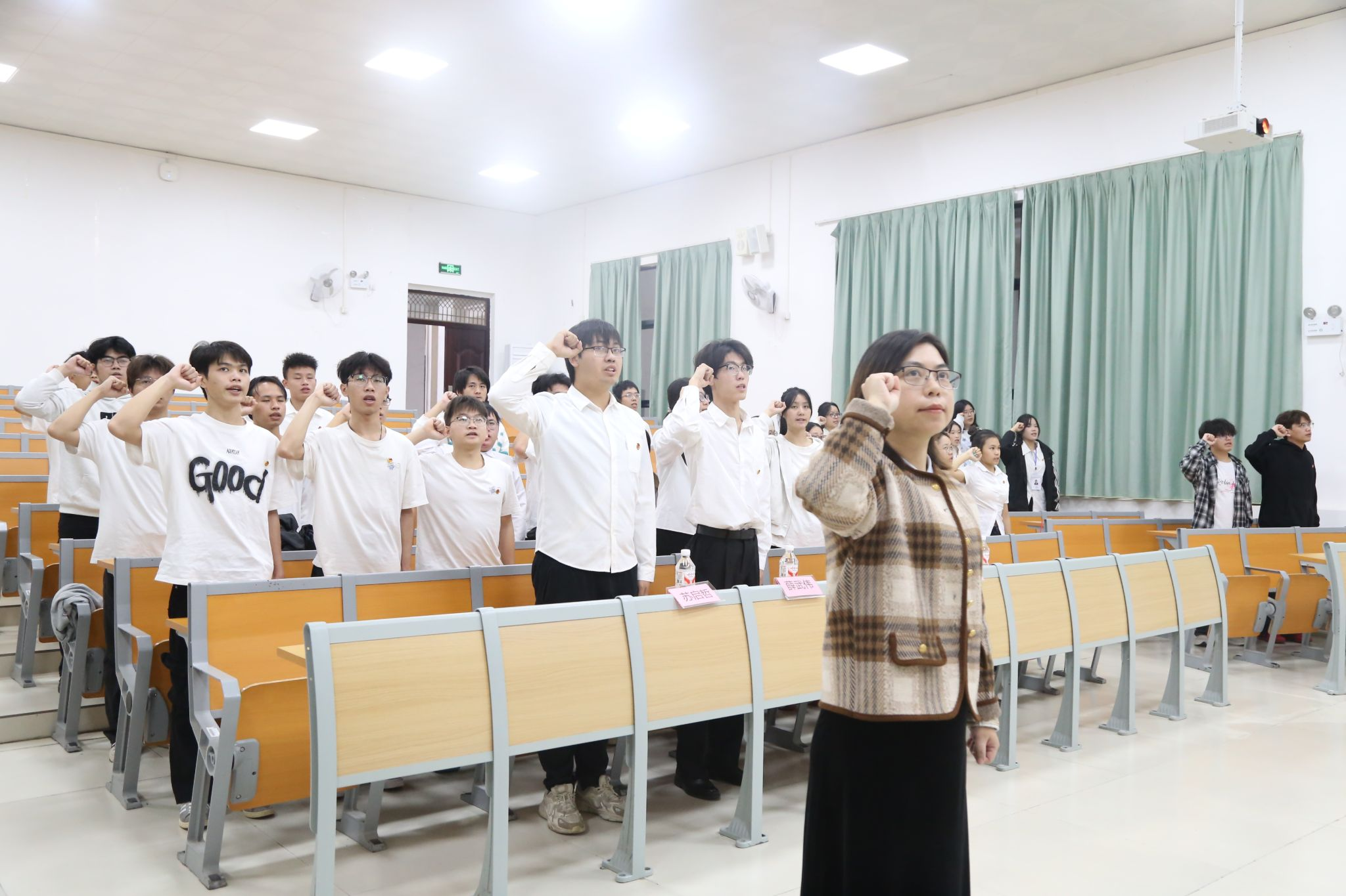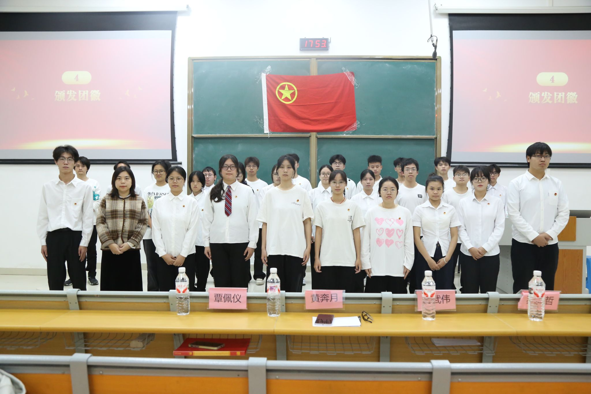 仪式在庄严的国歌声中拉开序幕。主持人黄炫皓同学现场宣读了新发展的26名团员名单。随后,黄奔月老师与团委副书记们共同为新团员佩戴团徽,标志着他们正式成为共青团的一员。在宣誓环节,全体新团员面向团旗,右手握拳,在黄奔月老师的领誓下庄严宣誓。