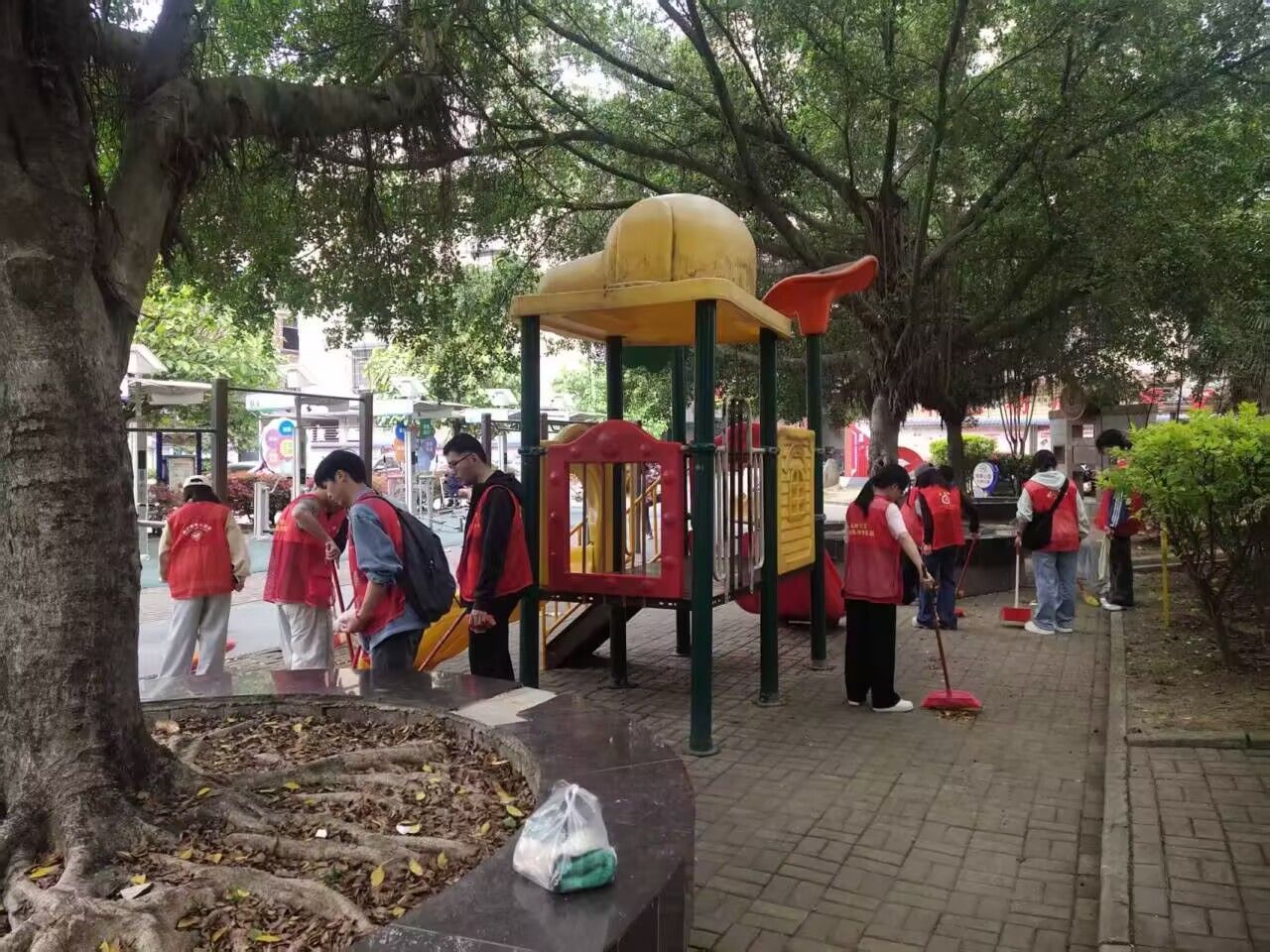 活动当天,志愿者们精神饱满地抵达红岭社区。在完成简短的分工安排后,大家迅速投入到清洁劳动中。志愿者们手持抹布、水桶、扫帚等工具,分组对社区内的公共设施和宣传栏进行细致擦拭,并对社区道路、绿化带及卫生死角进行全面清扫,以实际行动践行绿色低碳理念,助力社区环境提升。大家认真清理宣传栏上积存的灰尘,仔细擦拭健身器材和休闲长椅,不放过任何一处污渍。经过全体志愿者的共同努力,社区环境面貌焕然一新。
